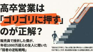 「高卒で営業なんて、きついだけで稼げないんじゃないか?」 「自分は口下手だし、あんな風にゴリゴリに押すなんて無理だ……」 もしあなたが今、そんな不安を抱えているなら、少しだけ僕の話を聞いてください。 かつての僕は、店舗で接客販売の仕事をして...