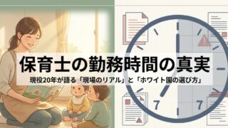こんにちはベルです。今回は保育士歴20年の友人にインタビューした記事となっています。 「保育士の勤務時間って実際どのくらいなの?」「残業は多い?休憩は取れる?」保育士を目指している方や転職を考えている方にとって、勤務時間は職場選びの最重要ポ...