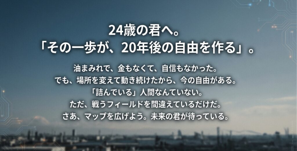 24歳の時の自分に戻れるなら、こう声をかけたいです。 「大丈夫、その一歩を踏み出す勇気が、20年後の自由を作っているよ」って。