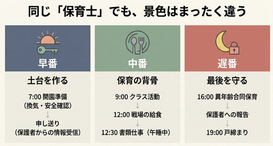シフトによって担当する業務は大きく異なります。現役20年の経験から、各シフトの実際の流れをお伝えします。