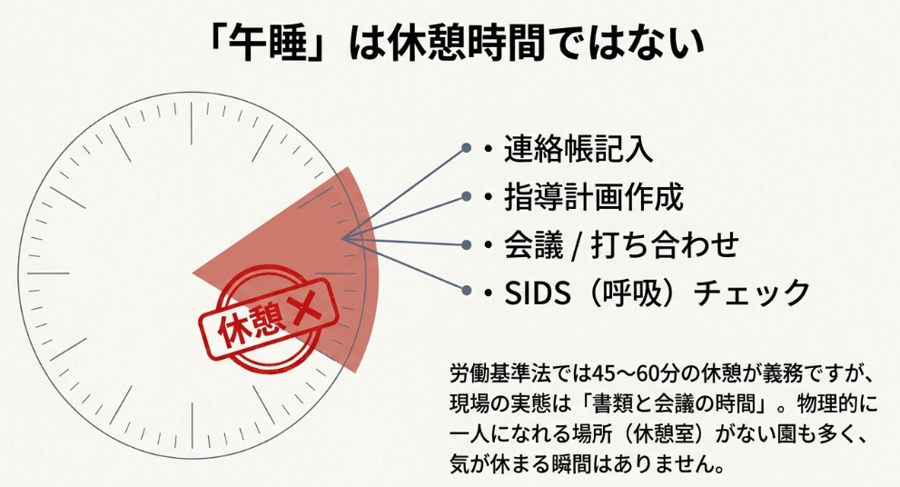 多くの保育園では、子どもの午睡(お昼寝)の時間が保育士の「休憩時間」として位置づけられています。しかし実態は、この時間に書類仕事・打ち合わせ・連絡帳の記入などの業務を行っており、完全な休憩にはなっていません。