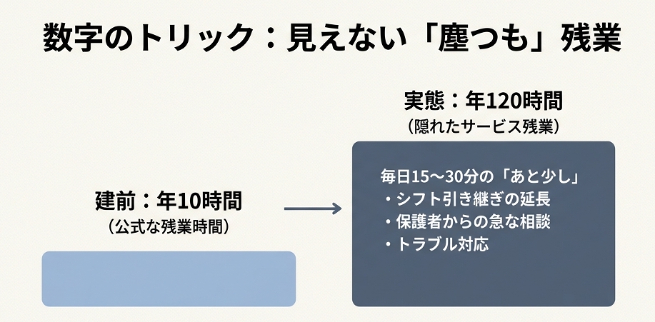 毎日のサービス残業15〜30分は、年間に換算すると60〜120時間に相当します。公式の残業時間だけを見て「残業が少ない職場」と判断するのは危険です。