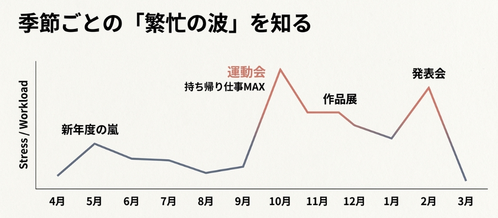 | 9〜10月 | 運動会(10月) | 練習・打ち合わせが増える、昼間の作業が進まず残業・持ち帰りが増加 |