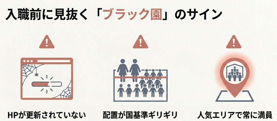 - ブラック園のサイン:ホームページが古い・定員に対して保育士が少ない