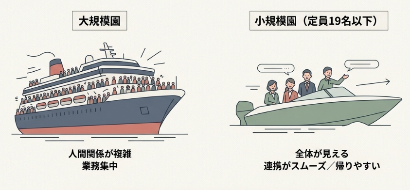 小規模保育園(定員19名以下)や認定こども園の中でも小規模な施設は、チームワークが取りやすく、問題が生じたときの改善スピードも速い傾向があります。