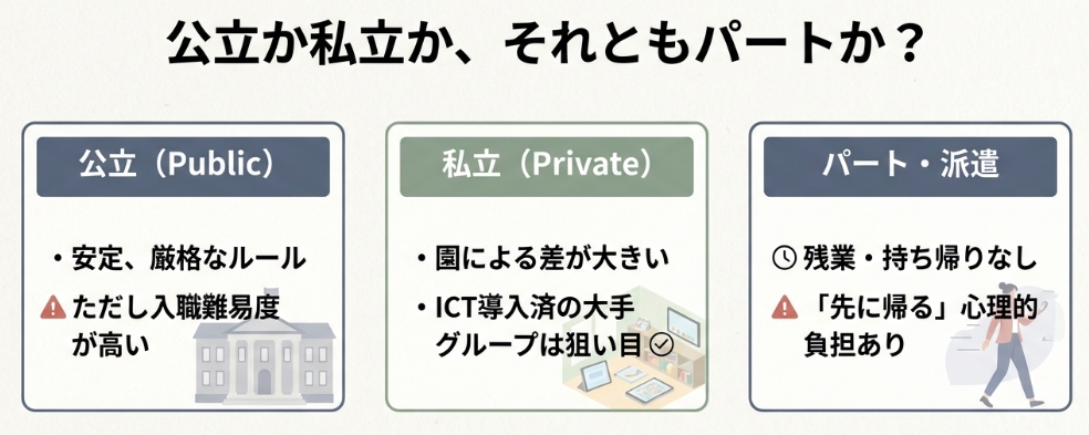 一般的に公立保育園(公務員保育士)は労働環境の整備が進んでいるケースが多く、残業管理が厳格な傾向があります。私立は園によって大きく異なりますが、ICT導入や働き方改革に積極的な私立園も増えており、一概に「公立が良い」とは言い切れません。見学・エージェントへの相談で個別の実態を確認することが最も確実です。