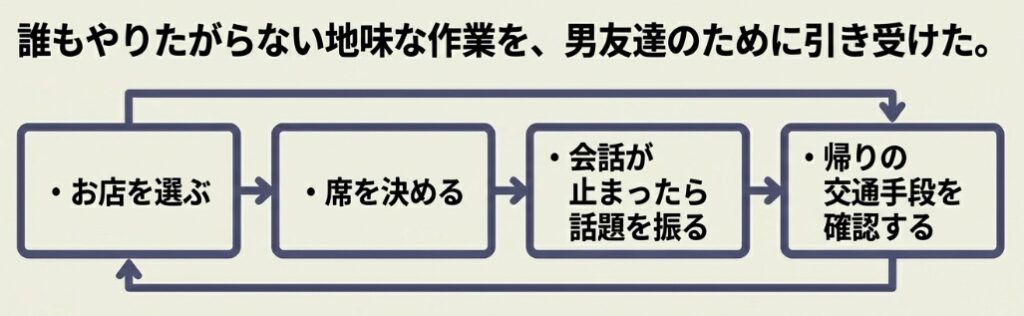 お店を選ぶ。席を決める。会話が止まったら話題を振る。帰りの交通手段を確認する。地味な作業の積み重ねだ。