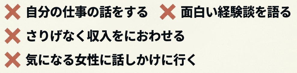 自分の仕事の話をする。面白い経験談を語る。さりげなく収入をにおわせる。気になる女性に話しかけに行く。