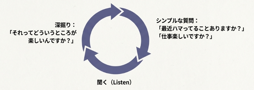 答えが返ってきたら、深掘りする。「それってどういうところが楽しいんですか?」と聞くだけで、相手は「ちゃんと聞いてもらえてる」と感じる。
