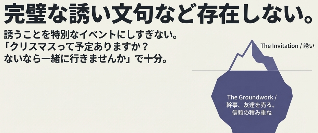 特別な言葉も、完璧なタイミングも必要ない。関係ができていれば、どんな誘い方でも伝わる。関係ができていなければ、どれだけ上手く誘っても無駄だ。
