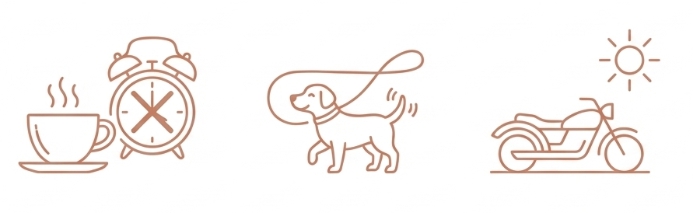 朝、目覚ましをかけません。天気が良ければバイクに乗ります。犬と散歩します。妻とゆっくり話します。