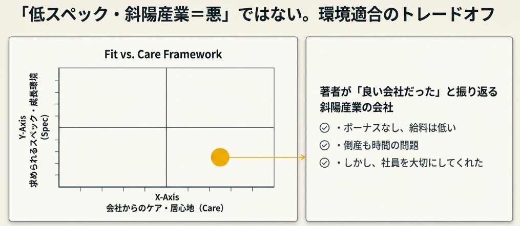 僕自身、大切にしてくれていた会社を辞めてから、初めてその価値に気づいた。次の職場に行って「あの環境は当たり前じゃなかった」とわかった。給料や肩書で判断すると、目に見えないものを失うことがある。